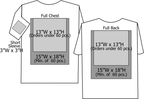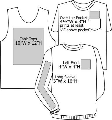 \ Maximum Image Area for Adult Garments The following pictures show the maximum image area for adult sized garments. The maximum image are is NOT to be exceeded. For any other location, please contact Summit for specific image area requirements.